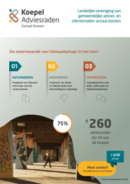 De Koepel is een vereniging van gemeentelijke adviesraden in het sociaal domein met landelijke dekking. Alle lokale adviesraden in het sociaal domein die het College van B&W en de gemeenteraad adviseren kunnen lid worden. Wanneer binnen uw gemeente een adviesraad lid is van de Koepel, dan mogen andersoortige adviesraden* meeliften op dit lidmaatschap. Als Koepel Adviesraden Sociaal Domein hebben we een missie: we willen adviesraden met elkaar verbinden en uitrusten met informatie en tools, zodat iedere adviesraad in staat is om de leef- en belevingswereld van inwoners binnen te brengen bij de gemeente. Circa 260 adviesraden zijn bij ons aangesloten - zo'n 75% van de Nederlandse gemeenten. We faciliteren onderlinge ontmoetingen, we bevorderen professionalisering en zorgen ervoor dat leden met vragen bij ons terecht kunnen. Hoe meer adviesraden zich aansluiten, hoe meer wij onderlinge kennisuitwisseling kunnen stimuleren.